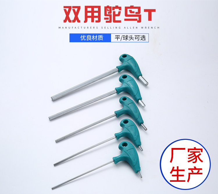 雙用鴕鳥T扳手有著L型扳手的力臂以及T型扳手的旋轉速度,不僅如此,它還有一個舒適的握柄。扳手按其結構的不同,可分為呆扳手、梅花扳手、兩用扳手、套筒扳手、鉤形扳手、內六角扳手、扭力扳手